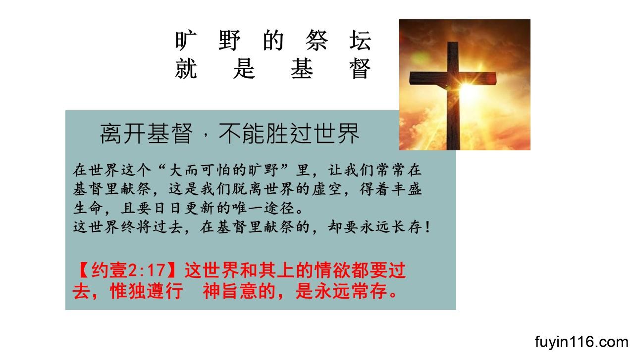 求主让每一个听众,从“旷野的祭坛”中得重要的提醒,认清世界的真相,看重你的生命之道,做智慧人,得激励,生命更新,改变提升。