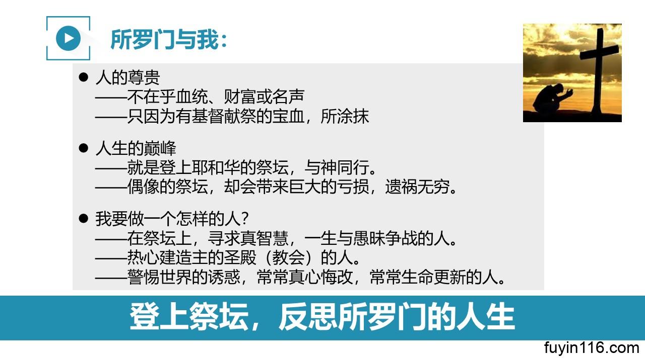 求主让每一个听众,从“所罗门的祭坛”中得重要的提醒,知道怎样成为一个尊贵的人、智慧的人、建殿的人,一个不被世界诱惑堕落的人。