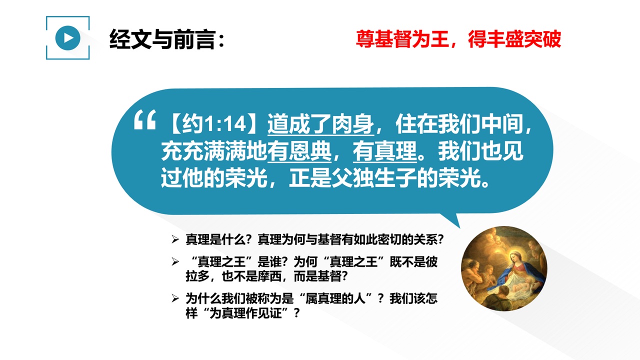 “道成肉身”的基督,称为“充充满满地有恩典,有真理”,主基督的话语里,也多次提及真理。