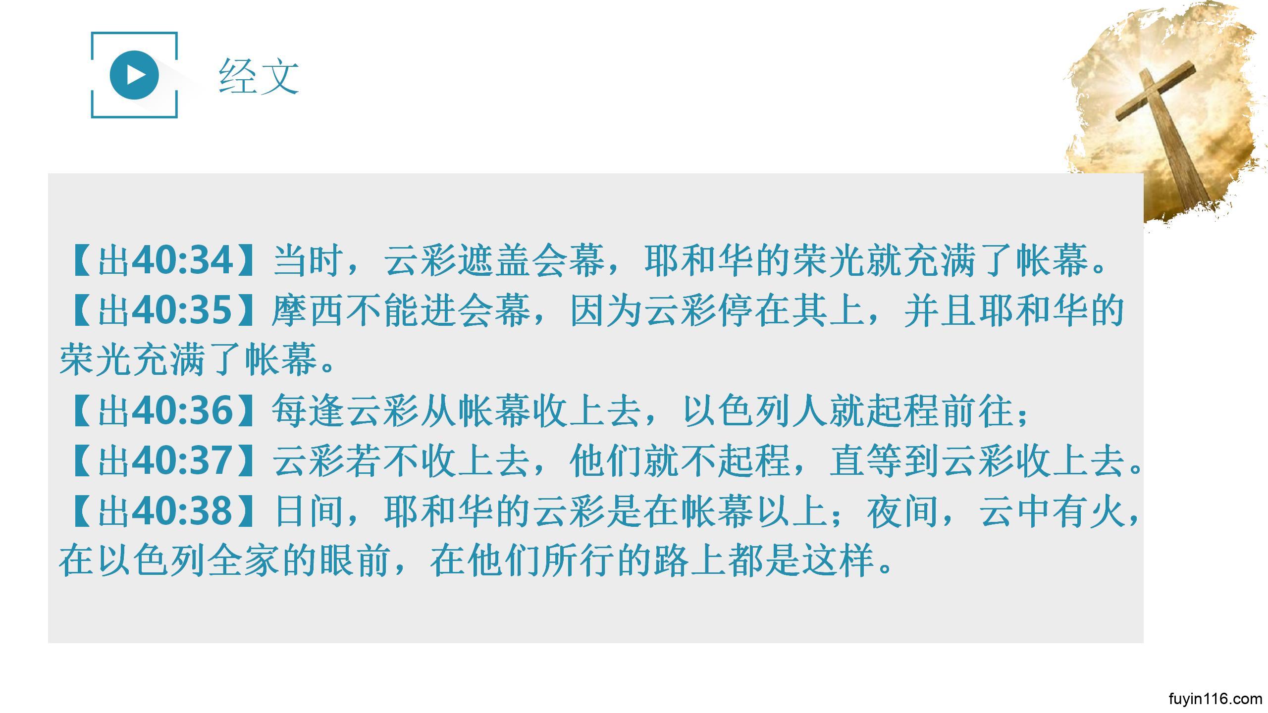 【出40:38】日间,耶和华的云彩是在帐幕以上;夜间,云中有火,在以色列全家的眼前,在他们所行的路上都是这样。