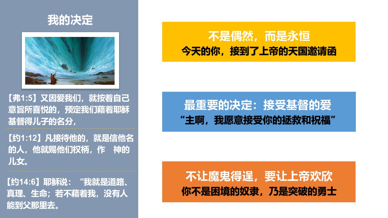 正如我们信息里说的,我们要得到“突破困境的祝福”,就要“信耶稣”,成为“上帝的儿女”,祂就必伸手搭救你,而且要使用你搭救更多陷在困境中的人。