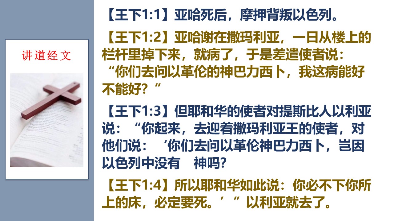 在《列王记下》第一章,记载了以利亚与恶王亚哈谢之间的一个发人深省的故事。