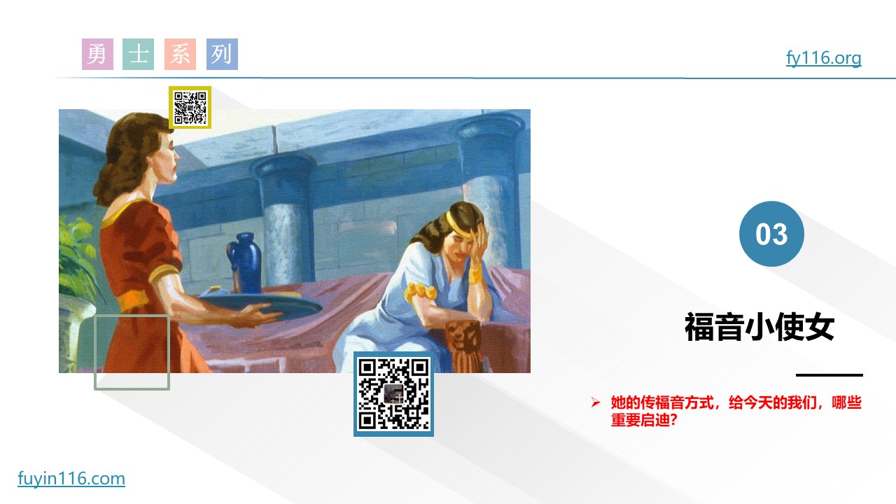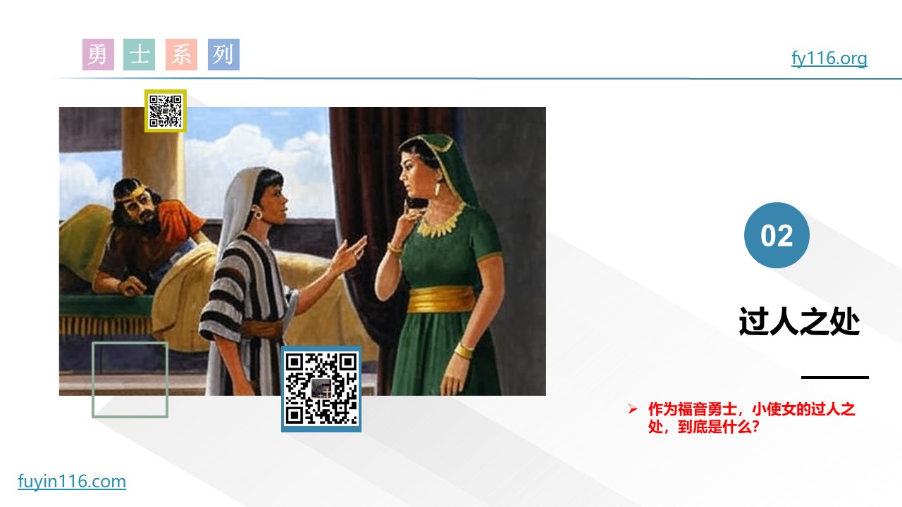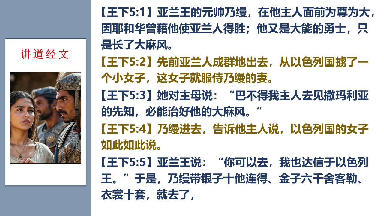 主耶稣在讲解福音时,曾特别提到“乃缦的故事”;乃缦身边的小使女,我们把她称为“福音小使女”。