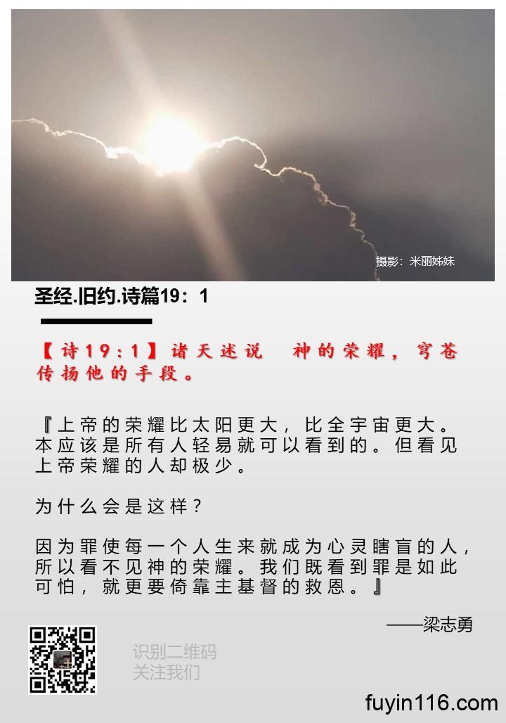 【诗19:1】诸天述说 神的荣耀,穹苍传扬他的手段。 《为何我们看不见最大的荣耀?》 作者:梁志勇牧师 朗诵:徐辉姊妹 【诗19:1】诸天述说 神的荣耀,穹苍传扬他的手段。 『上帝的荣耀比太阳更大,比全宇宙更大。本应该是所有人轻易就可以看到的。 但看见上帝荣耀的人却极少。 为什么会是这样? 因为罪使每一个人生来就成为心灵瞎盲的人,所以看不见神的荣耀。 我们既看到罪是如此可怕,就更要倚靠主基督的救恩。』 我们在天上的父,感谢赞美你! 你的话语一打开就发出亮光,能照亮我们的心灵,能让愚昧人得智慧。 当我们打开伟大的诗篇…