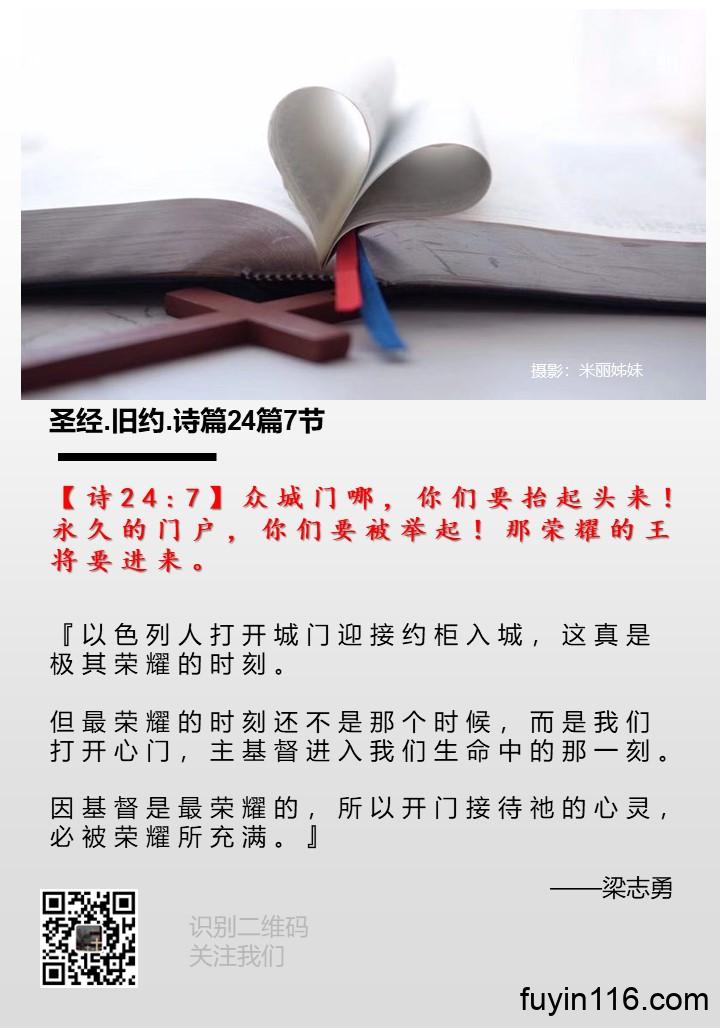 【诗24:7】众城门哪,你们要抬起头来!永久的门户,你们要被举起!那荣耀的王将要进来。 《最荣耀的开门》 作者:梁志勇牧师 朗诵:徐辉姊妹 【诗24:7】众城门哪,你们要抬起头来!永久的门户,你们要被举起!那荣耀的王将要进来。 『以色列人打开城门迎接约柜入城,这真是极其荣耀的时刻。 但最荣耀的时刻还不是那个时候,而是我们打开心门,主基督进入我们生命中的那一刻。 因基督是最荣耀的,所以开门接待祂的心灵,必被荣耀所充满。』 我们在天上的父,感谢赞美你 感谢你把《圣经》赐给我们,照亮我们的心,让我们看见以前从未看见的奇妙…