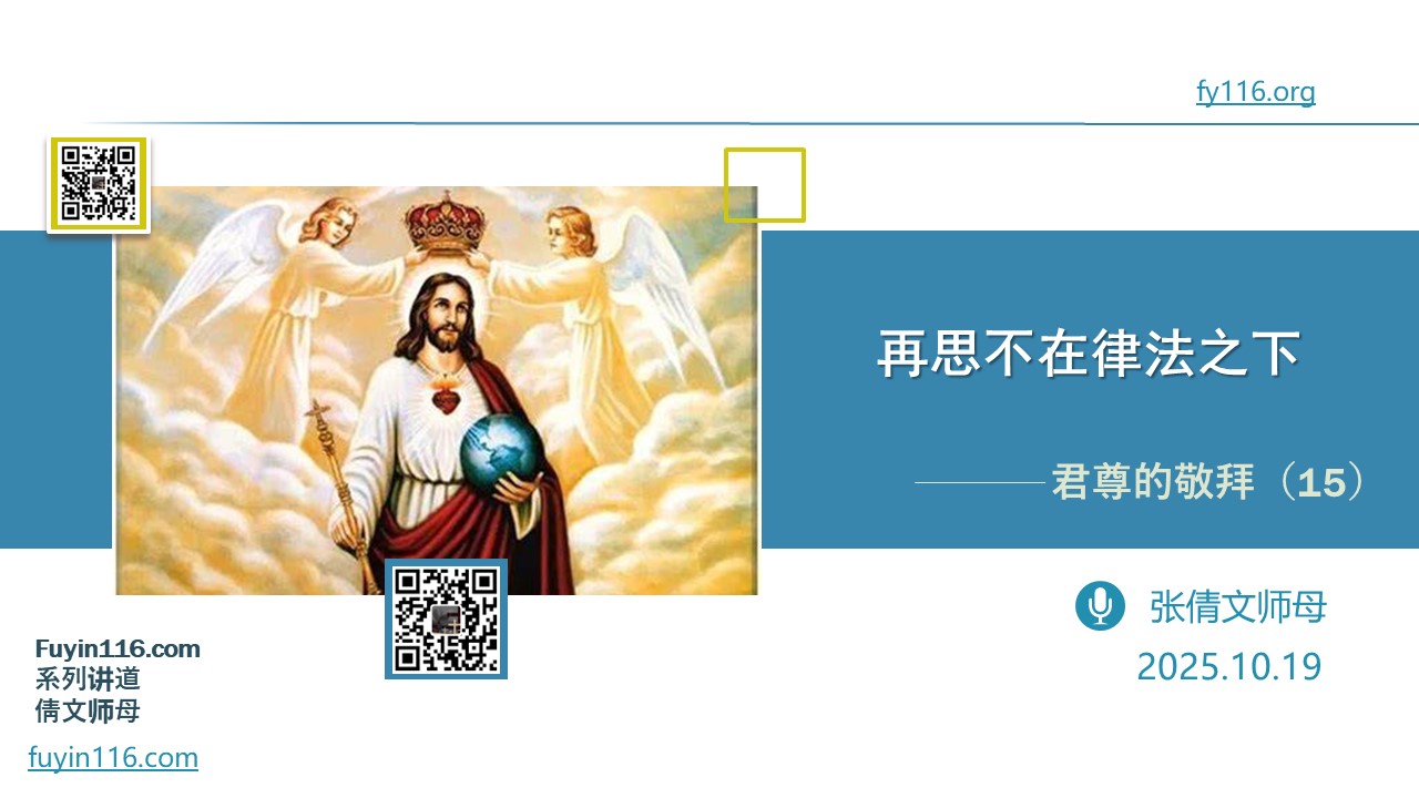 使徒保罗说“你们不在律法之下,乃在恩典之下”。 这节经文,其意涵到底是什么? 上帝赐下律法,其目的到底是什么? 福音与律法的本质区别,到底是什么?   愿上帝的祝福借着祂的真道,更多地临到每一个认真聆听的灵魂。 欢迎您收听: 《再思不在律法之下》 本文链接(若有朋友在微信里打不开本文,可以把下面的链接发给他,在浏览器里打开): https://fuyinradio.org/fx2f 您也可以点击下面的链接,重温之前的信息: 《君尊的敬拜系列》 ⚠️⚠️⚠️ 注意 ⚠️⚠️⚠️ 鼓励大家在手机浏览器或电脑浏览器…