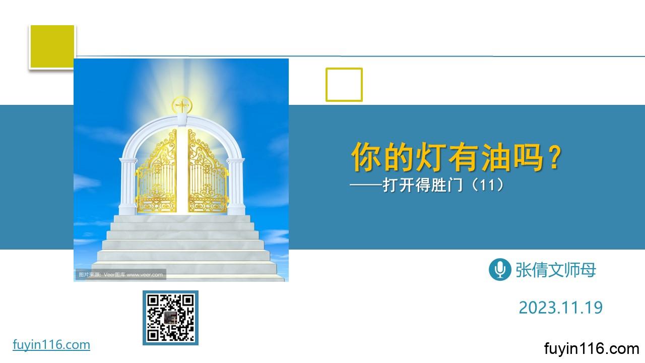 主基督讲的“童女和灯油”的比喻,给我们哪些重要的提醒? 这个故事给我们哪些激励? 我们怎样才能成为灯里有油的聪明童女? 愿上帝的祝福借着祂的真道,更多地临到每一个认真聆听的灵魂。 欢迎您收听: 《你的灯有油吗?》 https://fuyinradio.org/mjak 您也可以点击下面的链接,重温之前的信息: 《打开得胜门系列》 点击音频媒体前面的小三角“►”就可以播放 我们的阿爸天父,感谢赞美你 感谢你赐给我们《圣经》真理,让我们可以领受你恩典和真理的祝福。 我…