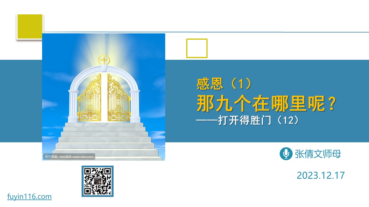 主耶稣曾经医好了十个大麻风病人,其中只有一人回来感恩。 这个故事,告诉我们“恩典的真理”是什么? 上帝赐给我们有哪两种恩典,两者的关系如何? 感恩的真义,到底是什么? 愿上帝的祝福借着祂的真道,更多地临到每一个认真聆听的灵魂。 欢迎您收听: 《那九个在哪里》 https://fuyinradio.org/ztxf 您也可以点击下面的链接,重温之前的信息: 《打开得胜门系列》 点击音频媒体前面的小三角“►”就可以播放 我们的阿爸天父,感谢…