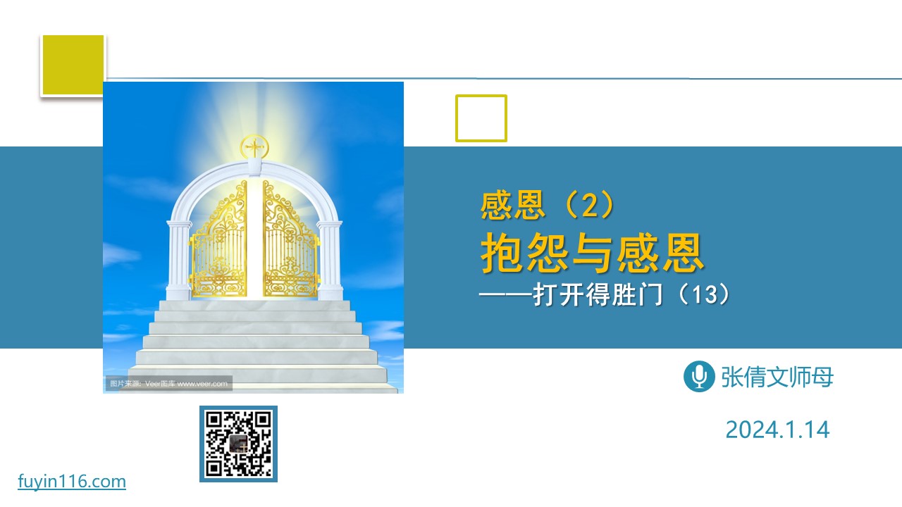 我们为何会感恩? 我们抱怨的根本原因,又是什么? 感恩和抱怨,对我们的生命分别有怎样重大的影响? 愿上帝的祝福借着祂的真道,更多地临到每一个认真聆听的灵魂。 欢迎您跟着我们的文章的提示,参加视频直播或收听录音: 《抱怨与感恩》 https://fuyinradio.org/81tn 您也可以点击下面的链接,重温之前的信息: 《打开得胜门系列》 点击音频媒体前面的小三角“►”就可以播放 我们的阿爸天父,感谢赞美你 感谢你赐给…