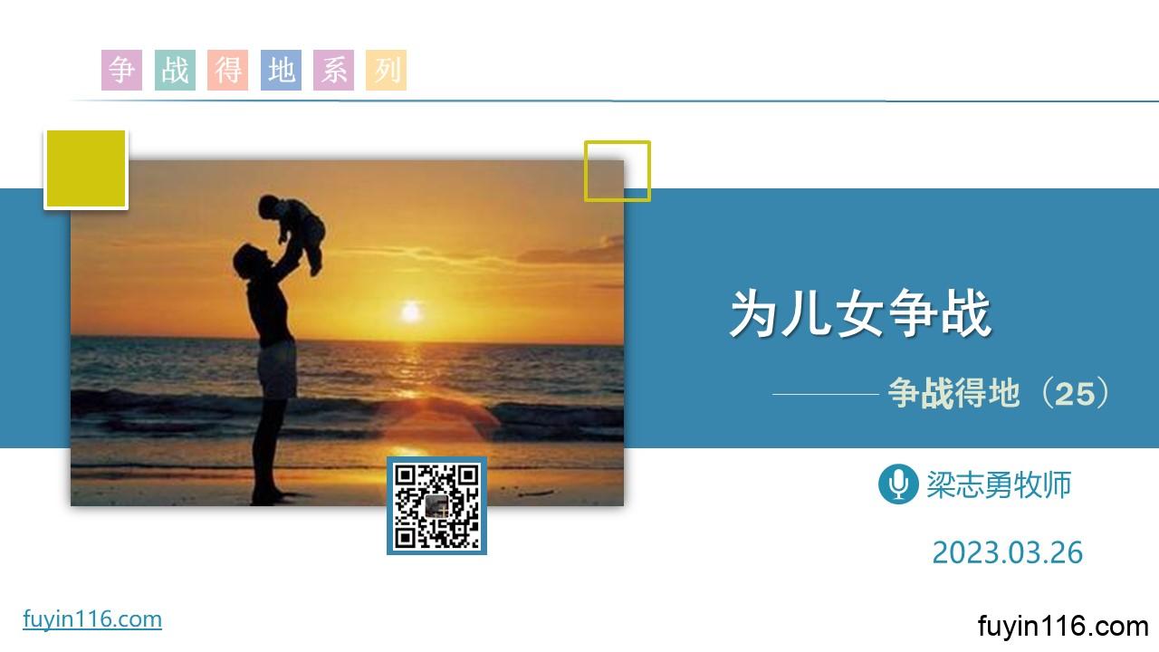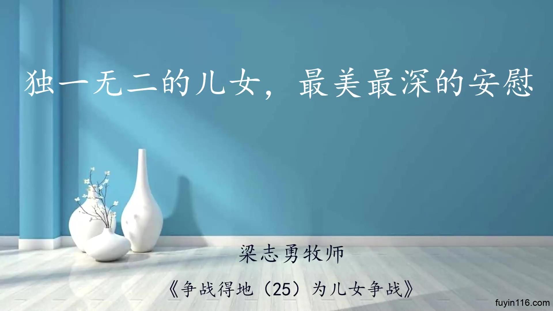我们的每一个儿女, 都是上帝独一无二的创造。 让我们不再固执攀比, 反而欣赏儿女的独特性; 让我们竭力为他们争战, 儿女就必成为我们 最美、最深的安慰。 ——梁志勇《为儿女争战》 《争战得地(25)为儿女争战》 《福音布道》系列 《争战得地》系列 《福音观影会》系列 《旧约里的福音》系列 《祭坛系列》讲道 《因信称义》系列讲道(更新中) 《希伯来书》系列讲道(全) 《出埃及记》系列讲道(全) 《讲道信息》汇总 《梁牧清风》圣经默想 《五饼二鱼》讲道剪辑 &nb…