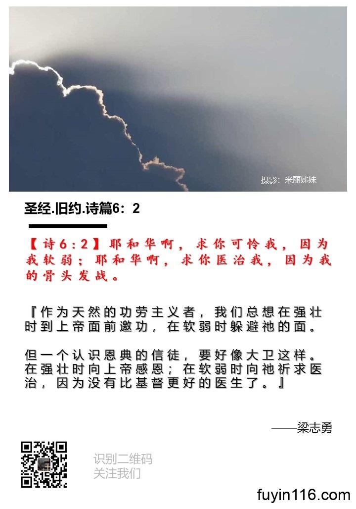 【诗6:2】耶和华啊,求你可怜我,因为我软弱;耶和华啊,求你医治我,因为我的骨头发战。 《介绍你认识一位最好的医生》 作者:梁志勇牧师 朗诵:徐辉姊妹 写于 2020年5月 【诗6:2】耶和华啊,求你可怜我,因为我软弱;耶和华啊,求你医治我,因为我的骨头发战。 『作为天然的功劳主义者,我们总想在强壮时到上帝面前邀功,在软弱时躲避祂的面。 但一个认识恩典的信徒,要好像大卫这样。在强壮时向上帝感恩;在软弱时向祂祈求医治,因为没有比基督更好的医生了。』 亲爱的主耶稣基督,我们感谢和赞美你, 你…