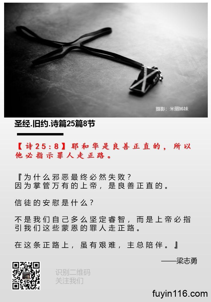 【诗25:8】耶和华是良善正直的,所以他必指示罪人走正路。 《为什么邪恶终必失败?》 作者:梁志勇牧师 朗诵:徐辉姊妹 【诗25:8】耶和华是良善正直的,所以他必指示罪人走正路。 『为什么邪恶最终必然失败? 因为掌管万有的上帝,是良善正直的。 信徒的安慰是什么? 不是我们自己多么坚定睿智,而是上帝必指引我们这些蒙恩的罪人走正路。 在这条正路上,虽有艰难,主总陪伴。』 主耶稣基督,感谢赞美你 求你祝福我们每一位读者,让我们通过我们这短短的分享,认识奇妙的真理。因为你的话语一解开,就发出亮光,使愚人通达(…