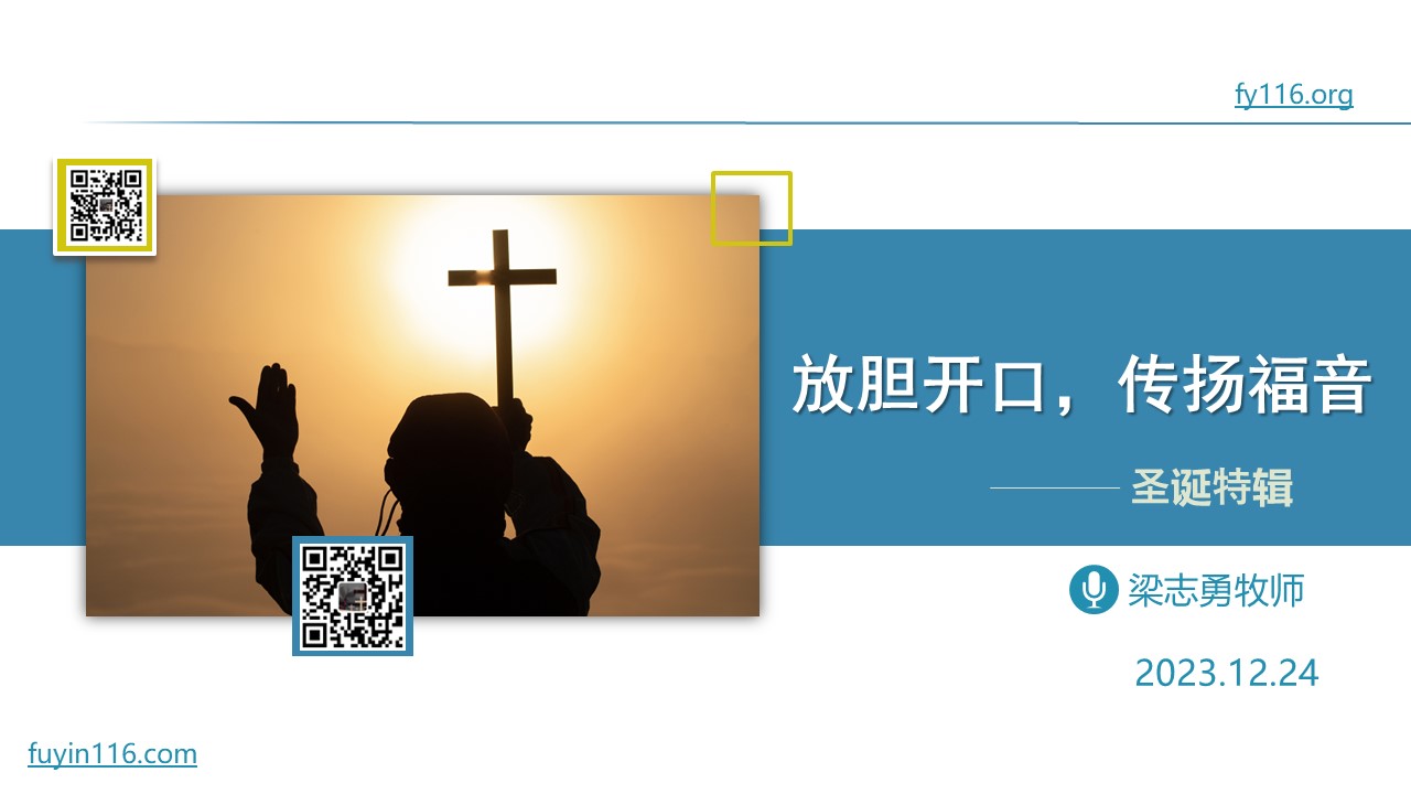 12月24日的主日,正好也是平安夜,我们有一次“圣诞特辑”的专题分享。 我们怎样才能放胆开口,传扬福音? 我们应该怎样放胆开口,向谁开口? 我们应该怎样放胆传扬福音? 愿上帝的祝福借着祂的真道,更多地临到每一个认真聆听的灵魂。 欢迎您收听: 《放胆开口,传扬福音》 https://fuyinradio.org/tfjo 点击音频媒体前面的小三角“►”就可以播放: 墙外观看: 我们的阿爸天父,感谢赞美你 感谢你赐给我们《圣经》真理,让我们可以领受你恩典和真理的祝福。 我们特别感谢…