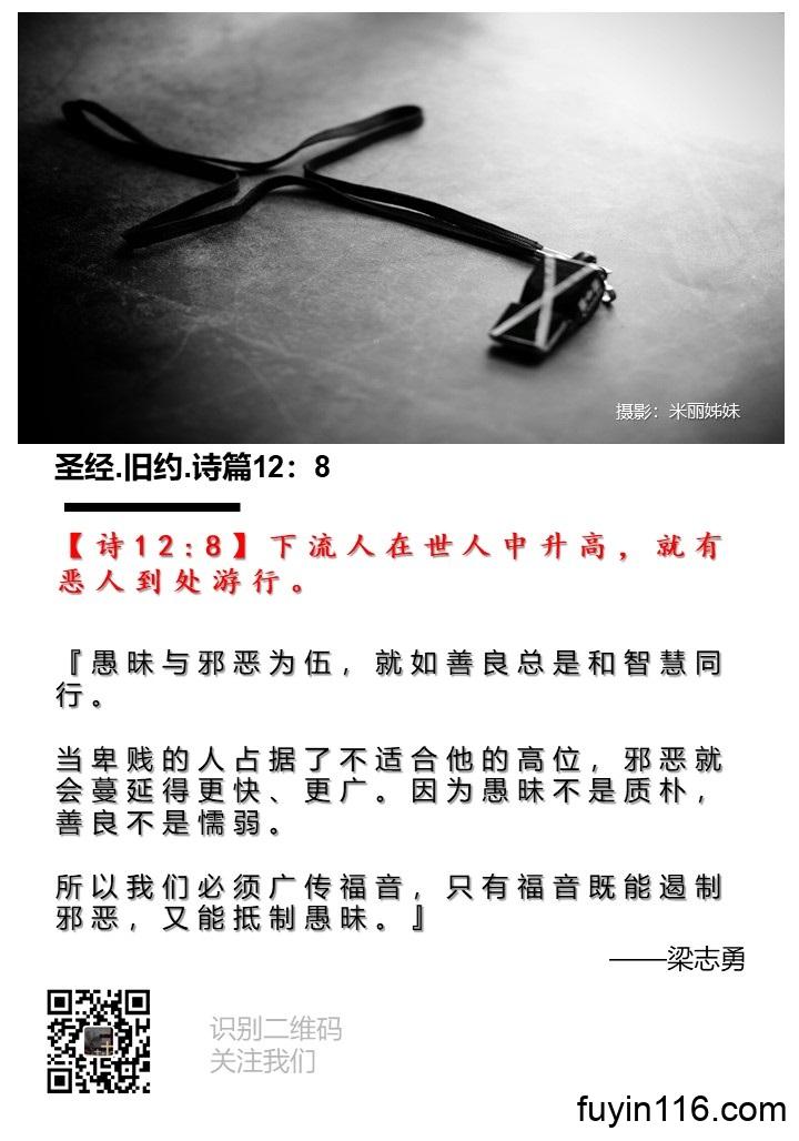 【诗12:8】下流人在世人中升高,就有恶人到处游行。” 《愚昧与邪恶为伍,善良与智慧同行》 作者:梁志勇牧师 写于 2020年5月,为纪念吹-哨-人 李*wen *亮 医 生 朗诵:徐辉姊妹 【诗12:8】下流人在世人中升高,就有恶人到处游行。 『愚昧与邪恶为伍,就如善良总是和智慧同行。 当卑贱的人占据了不适合他的高位,邪恶就会蔓延得更快、更广。 因为愚昧不是质朴,善良不是懦弱。 所以我们必须广传福音,只有福音既能遏制邪恶,又能抵制愚昧。』 爱我们的天父,我们感谢和赞美你 感谢你赐给我们奇妙的《圣经》…