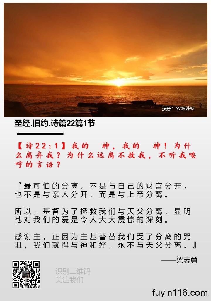 【诗22:1】我的 神,我的 神!为什么离弃我?为什么远离不救我,不听我唉哼的言语? 《最可怕的分离是什么?》 作者:梁志勇牧师 朗诵:徐辉姊妹 【诗22:1】我的 神,我的 神!为什么离弃我?为什么远离不救我,不听我唉哼的言语? 『最可怕的分离,不是与自己的财富分开,也不是与亲人分开,而是与上帝分离。 所以,基督为了拯救我们与天父分离,显明祂对我们的爱是令人大大震惊的深刻。 感谢主,正因为主基督替我们受了分离的咒诅,我们就得与神和好,永不与天父分离。』 主耶稣基督,感谢和赞美你。 你是我们的救主,你为了拯救我们,…